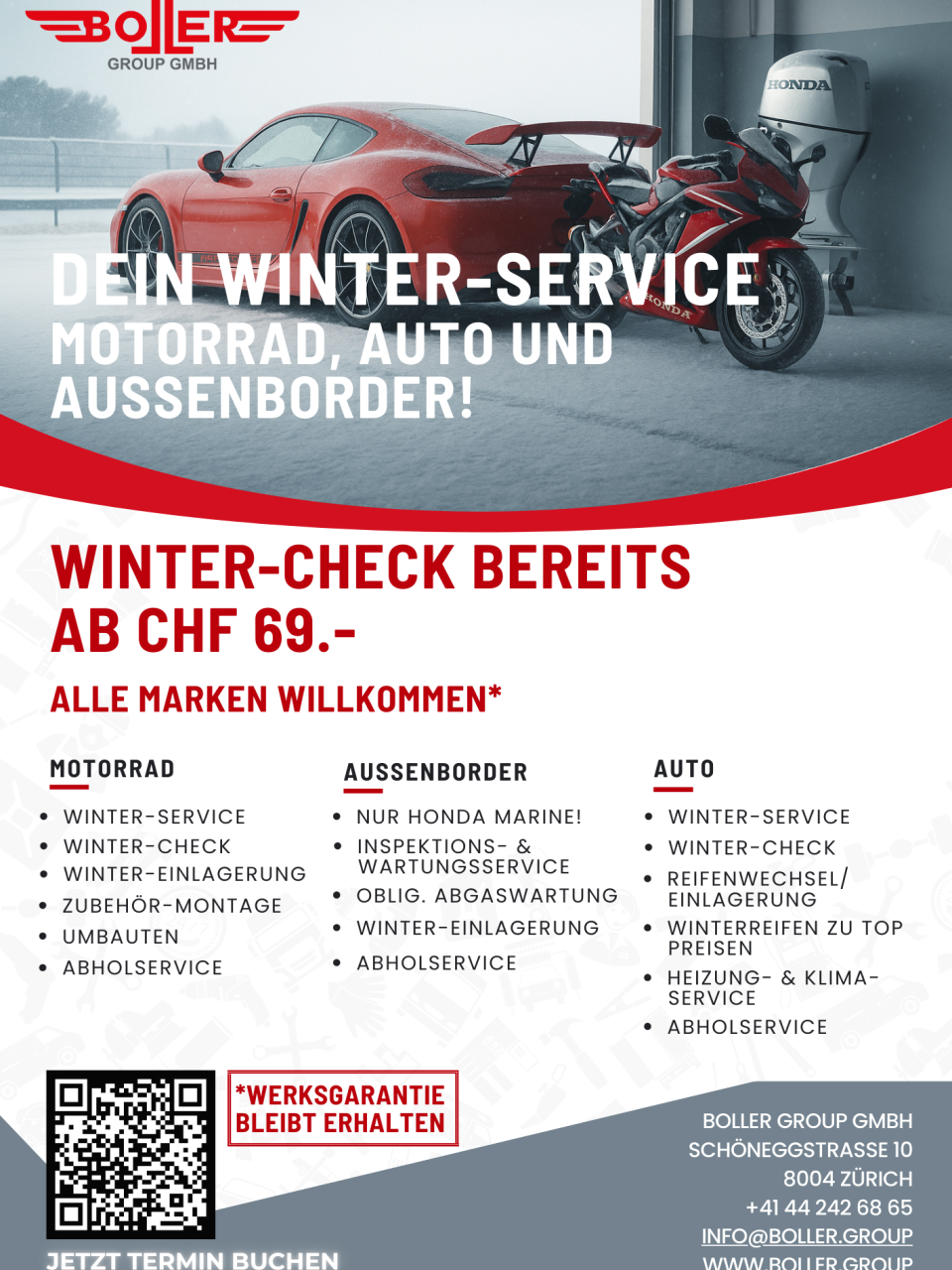 Winter? Kein Problem! Ob Motorrad, Auto oder Bootsmotor, unser Winterservice schützt zuverlässig vor Kälte, Feuchtigkeit und Abnutzung. Dein Fahrzeug bleibt gepflegt, sicher und startklar. Jetzt Winterservice buchen und sorgenfrei durch die Saison gehen!
